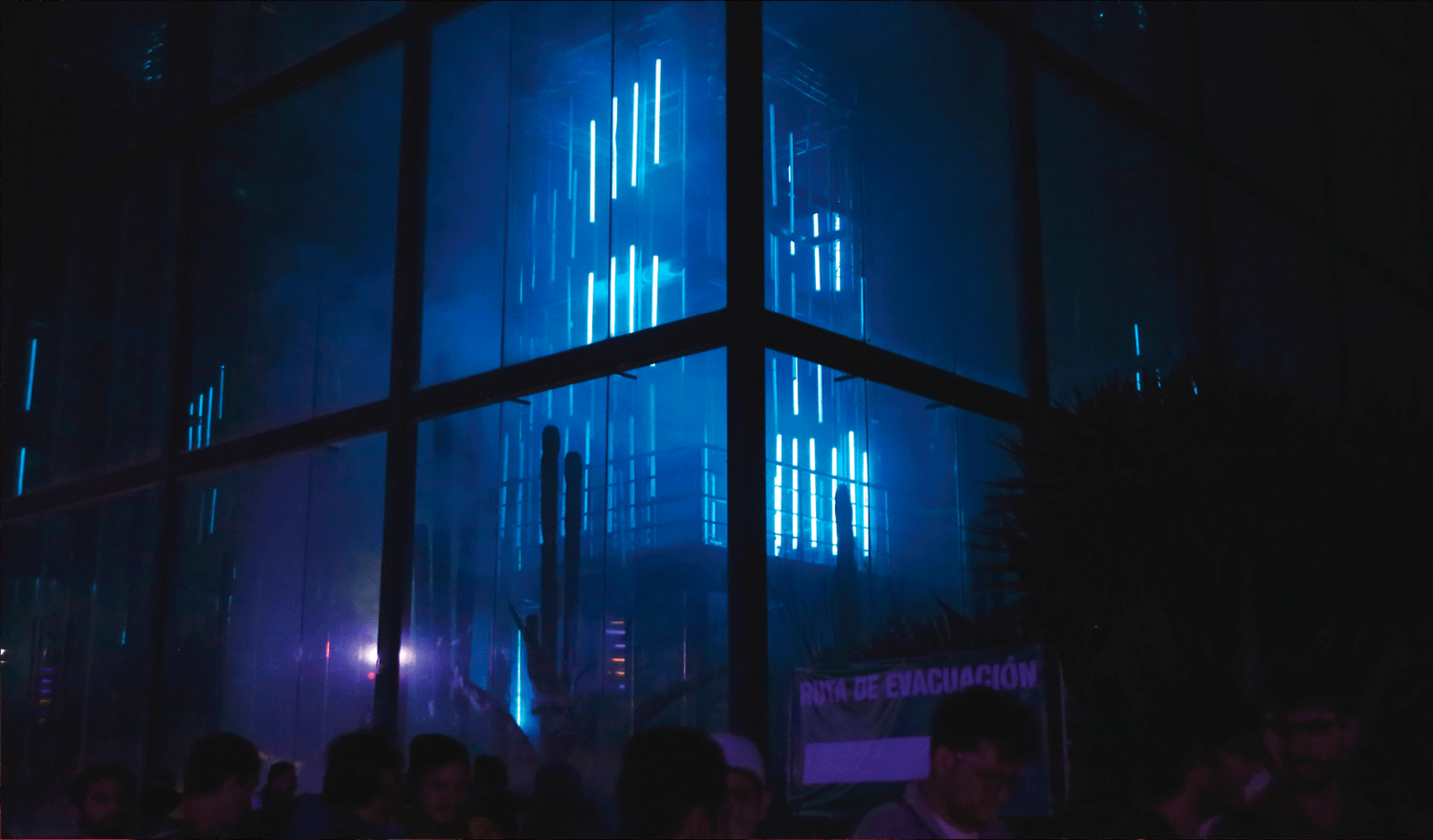 Teorema is an installation that uses lighting, verses programmable tubes and lasers to generate a narrative journey through changes in lighting that take place during the duration of the festival, in this way the piece remains changing and dynamic by presenting variations and evolving to take concluded the event